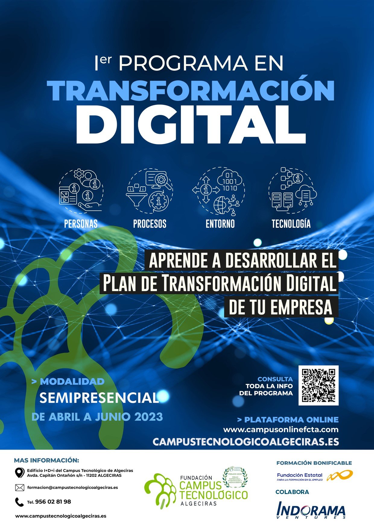 SESIONES PRESENCIALES Lugar: Edificio I+D+i del Campus Tecnológico de Algeciras PROGRAMA COMPLETO: https://campustecnologicoalgeciras.es/cursos/i-programa-en-transformacion-digital/ 40 horas presenciales (10 sesiones) + 60 horas de autoestudio Bonificable por FUNDAE para las empresas hasta el 67%.